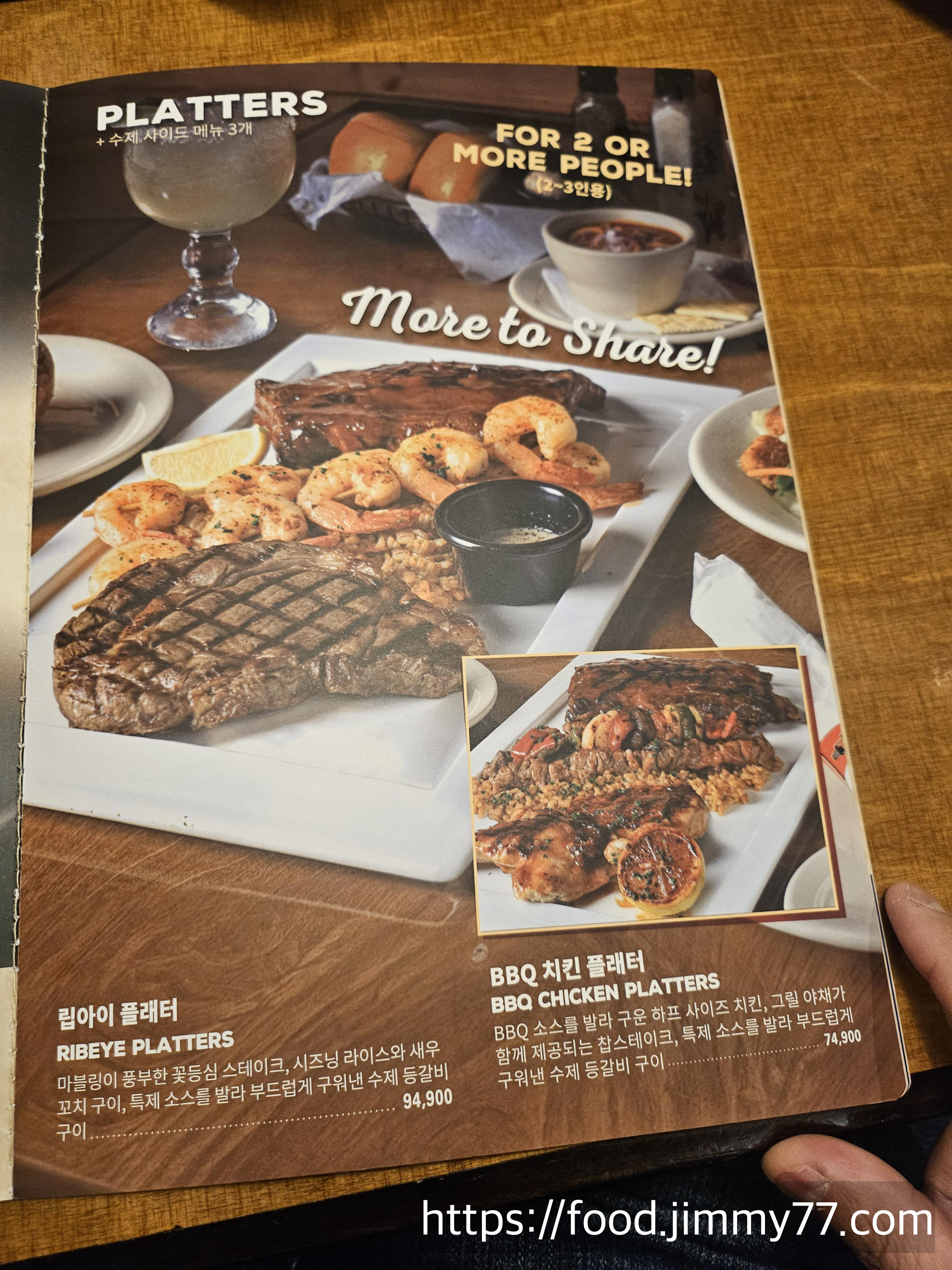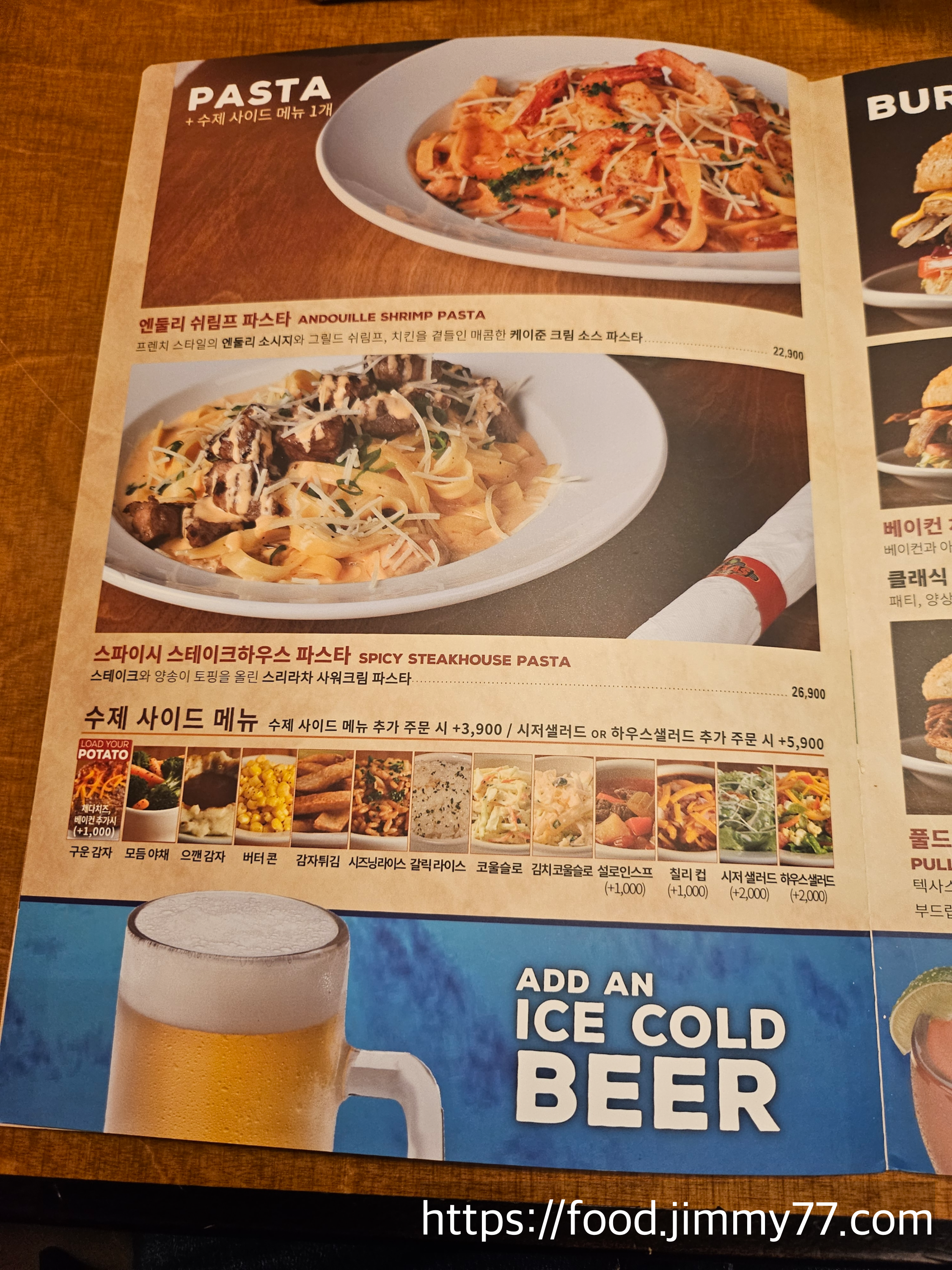 메뉴가 너무 많아 처음 방문하시면 엄청 고민하시는데요 저는 항상 스테이크 또는 치킨류 고기 하나 시키고 파스타와 사이드 메뉴시켜 먹어요 텍사스 로드하우스는 1인 1 메뉴 하면 절대 더 먹지를 못하겠더라고요 일반 패밀리 레스토랑 가면 보통 한 개 정도 추가로 시켜 나눠먹고 하는데요 여기서는..... 그게...... 어렵네요