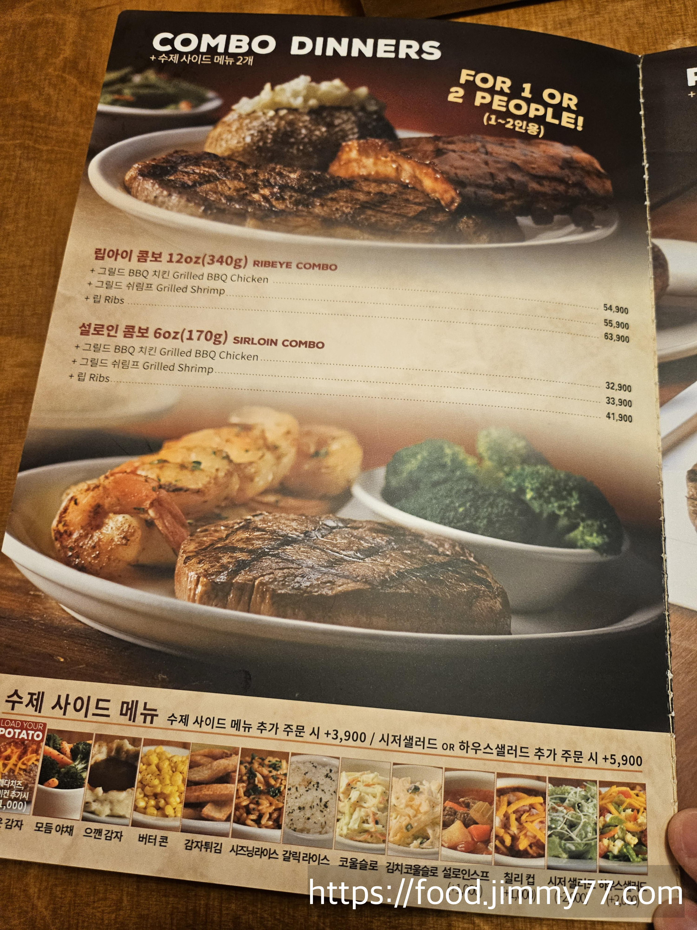 텍사스 로드하우스 메뉴는 상당히 많은데요 저희는 일단 스테이크가 좋아서 오는 거라 스테이크 위주로 주문해요 버거류도 맛있을 거 같은데 한 번도 도전해 보지 못했네요 저희는 일단 스테이크는 설로인 11oz 로하나 선택했고요 사이드 메뉴에 샐러드 선택할 거라 샐러드류는 패스할게요~