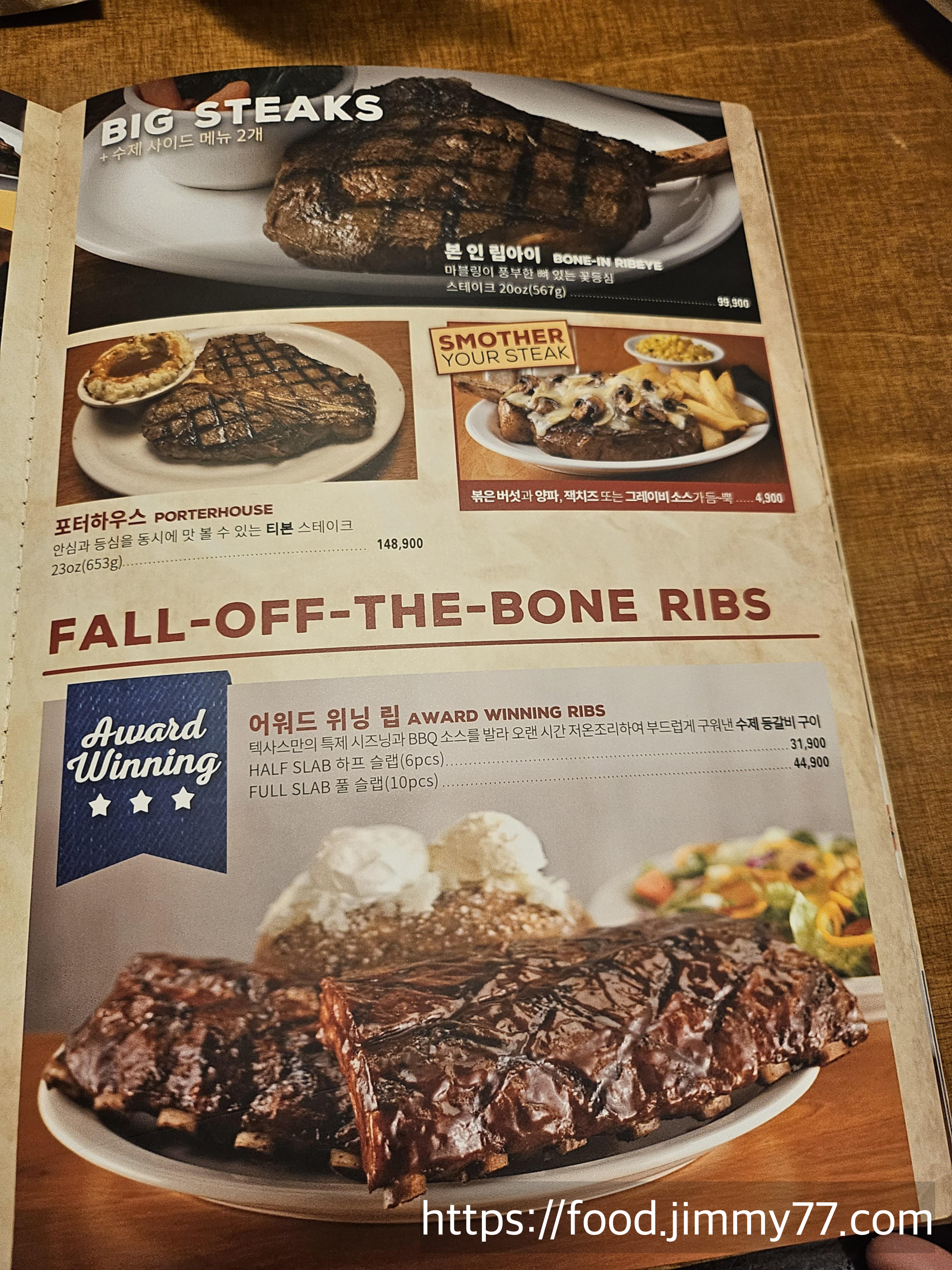 처음 남양주점 방문했을 때 멋모르고 립까지 시켜 배가 터지는 줄 알았네요 립 양이 어마무시해요 물론 스테이크도 엄청 커요 스테이크 시켰으니 립도 생략할게요 포터하우스는 항상 궁금한데 2인이 와서 먹기에 좀 부담돼서 한 번도 시켜 보지 못했는데요 다음에는 아침부터 굶고 와서 도전해 봐야 할 거 같아요