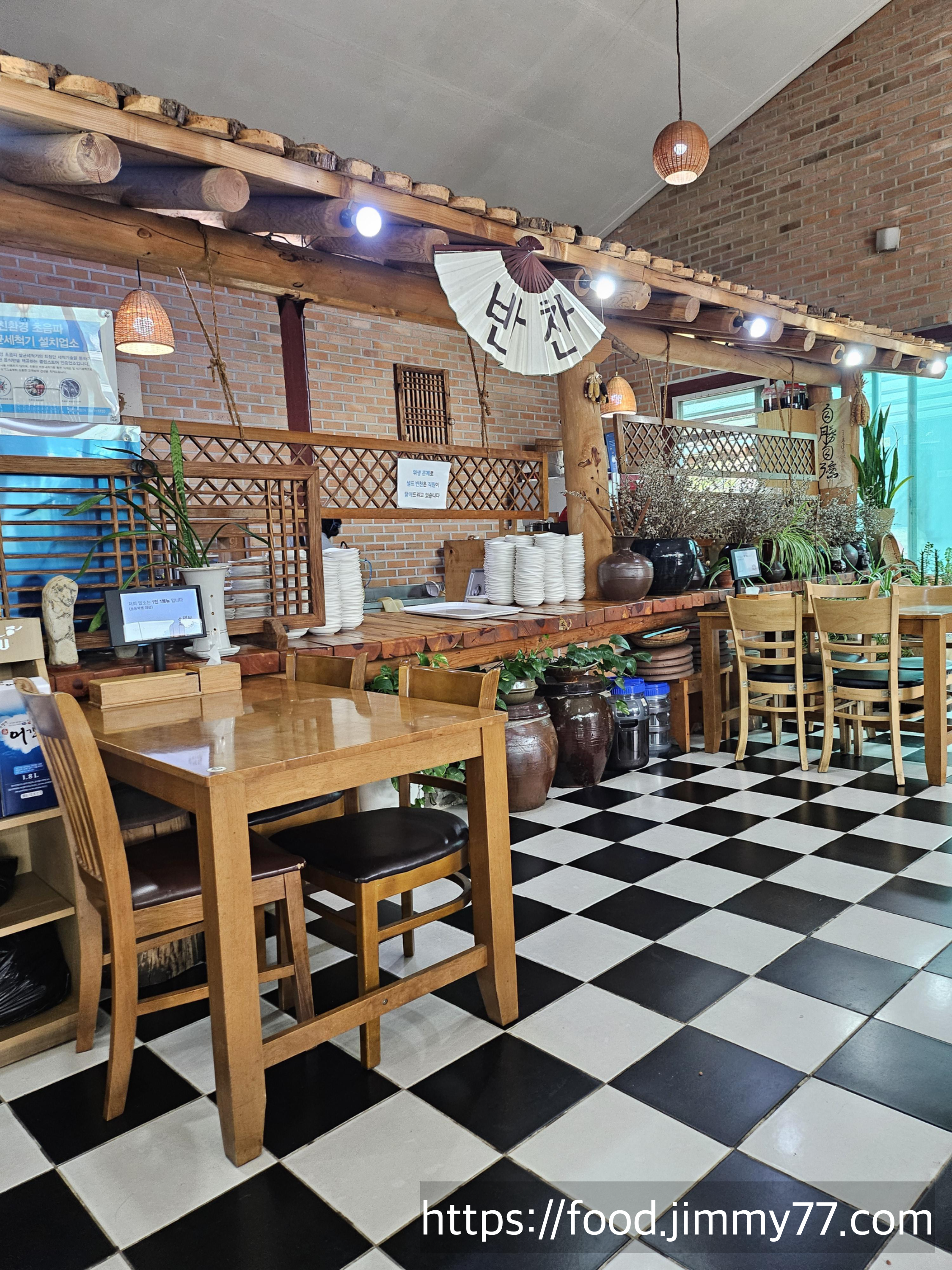 홀은 50석가량 되는 적당한 크기예요 카운터 옆에 추가반찬을 받으실 수 있는 셀프바도 준비되어 있네요 셀프 바 이기는 하지만 빈드릇 가져가시면 반찬은 직원분이 담아주세요