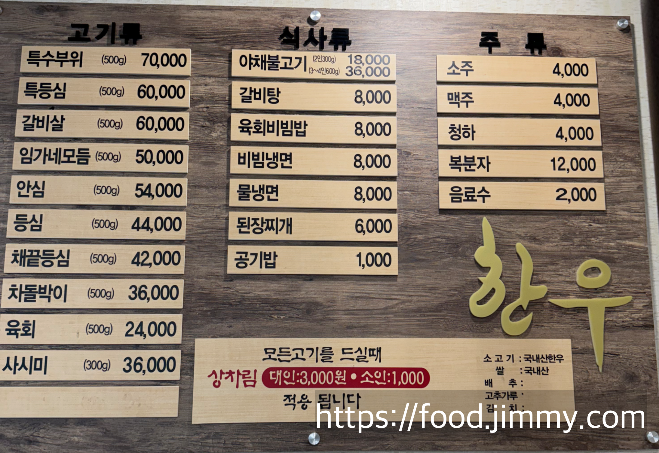 정육식당이라 가격은 저렴한 편이에요 물론 상차림비는 따로 있으니 참고하시고요