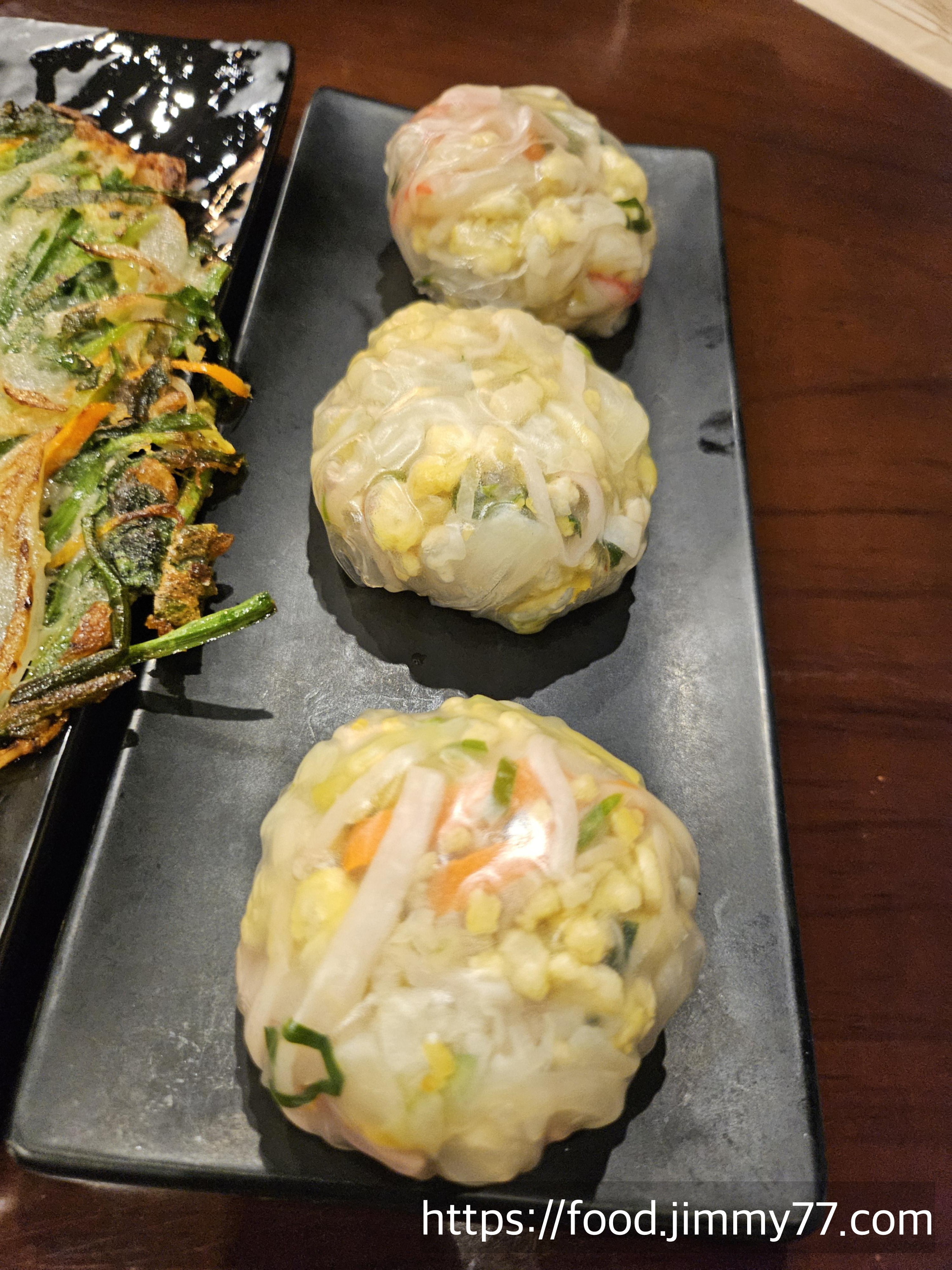 주문하고 잠시 기다리시면 만두같이 생긴 월남쌈과 부추전 그리고 묵사발이 나와요 국이나 찌개가 따로 나오지 않고 묵사발을 주시나 봐요